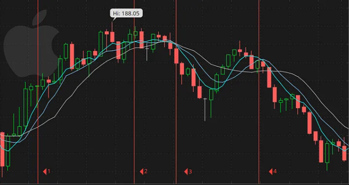 - We notice the 5-day SMA intersect the 8 and 10 day SMAs. Then, the 8-day SMA intersects the 13-day SMA. Finally, the 13-day SMA begins to trend upwards. This indicates that a trend is emerging and we can interpret this as a buy signal for a CALL option.