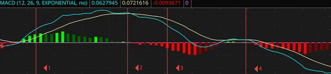 The lines converge (the histogram bars become very short). This tells us that the upward momentum of the chart is weakening. We can interpret this as a sell signal for a CALL option.